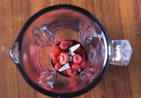 Add the cherries (cleaned and pits removed) to a blender. About 15 is good if you're just making a glass for yourself; use more if you plan on serving to a group. Or if you just want some for later! The easiest way to clean and de-pit the cherries is to place them in a bowl, run them under cold water, and strain. Then score the cherries vertically, and remove the pit with the edge of a butter knife.