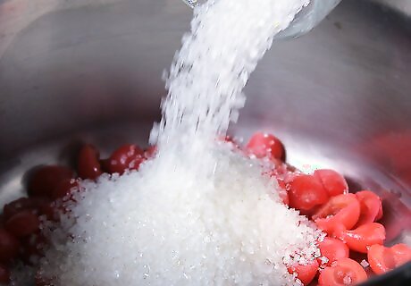 Put the clean, seedless cherries and sugar in a saucepan. If you want your cherries on the super-tart side, add less sugar. You can also use a sugar substitute (like Splenda), honey, or agave syrup. To get the cherry pits out, score them along their sides with a knife. You may be able to pop the pits right out -- or just take a butter knife and wedge them out if they're being difficult.