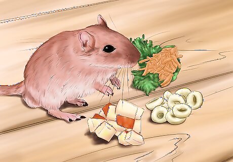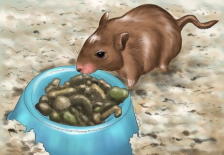 Feed your gerbil a special gerbil seed mix. Look for a specially formulated gerbil food mix at your local pet store. Follow the package instructions for how much to give your gerbil each day and serve the food in a small ceramic dish placed inside of his cage. One way that you can begin to bond with your gerbil is to pick out some of the larger seeds from the mix, such as the sunflower seeds, and feed them to your gerbil by hand. Make sure the seeds are not too large or too small, as your gerbil may choke.