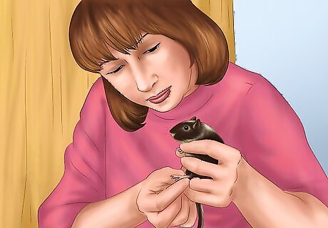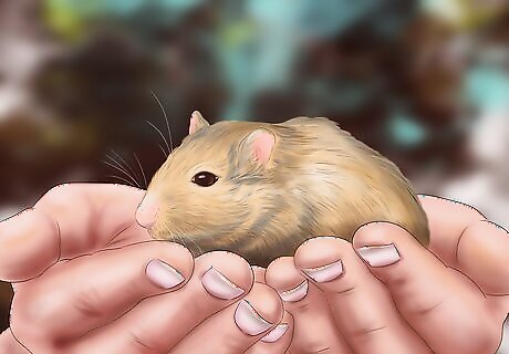 Handle your gerbil with care. It will take some time and patience before your gerbil is ready to let you hold him. Build up his trust in you by allowing him to sniff your hand and even give you a little nibble. You can also offer your gerbil some treats from your hand to build up his trust in you. Once your gerbil is more comfortable with you, you can try to pick him up. To pick up your gerbil, gently cup both hands around him and lift him slowly out of his cage. Do not swoop in and grab him or you will startle him and cause him to hide from you. Never grab the gerbil by the tail, as this could seriously injure it.