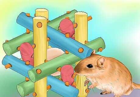 Provide toys for your gerbil. Just make sure that the toys are not made from soft plastic because your gerbil will chew these items to shreds. Look for toys that your gerbil will not be able to shred, such as strong wooden toys. Anything made of cardboard will also get chewed to shreds, but it won't hurt your gerbil.