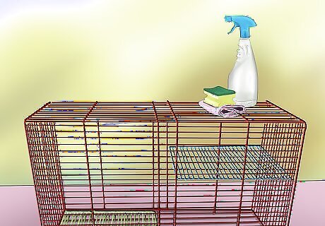 Clean your gerbil’s cage regularly. To help keep your gerbil happy, you will need to keep his cage nice and clean. Once per week you should also perform a deep cleaning on your gerbil’s cage. Remove everything from your gerbil’s cage (including your gerbil) and scrub the sides and bottom with warm, soapy water. Then rinse and dry the cage before putting in new bedding, your gerbil’s accessories, and your gerbil. In addition to a weekly deep clean, you should also do the following every day: Remove and replace any soiled or damp bedding. Remove and dispose of droppings. Remove old food.