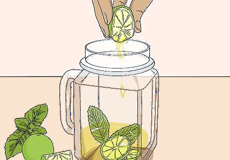 Mix lime and mint in a jar. Lime and mint create a strong, fresh scent together. Try mixing lime juice, either fresh squeezed or store-bought, and add some fresh mint. Transfer the mixture to a jar and set it out opened in a room to freshen up the smell. If you have pets or young children, make sure to place your jar out of their reach. Throw this out at the end of the day. You can make a new one for tomorrow if you liked the smell.