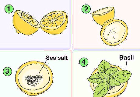Use fruit rinds as air fresheners. For a simple, DIY air freshener, simply cut a citrus fruit in half and empty out the fruit to get the bowl-shaped rind. Place something like sea salt in the rind to weigh it down. You can also add fresh herbs, like basil. Set your air freshener down in a room to create a fresh, natural scent.