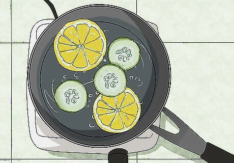 Simmer fruits and vegetables. Place strong-smelling fruits and vegetables in a pot and cover them with water. Simmer the pot over low heat to create a fresh spring smell. You can leave the pot on the stove to create a smell, as long as you check the water once in awhile and replace it as necessary. Also, do not leave anything on your stove if you leave your home. Store your ingredients in a mason jar in your fridge when you're done creating the smell. Simmer pot ingredients last about two to three weeks when stored in this fashion. Citrus fruit, such as lemon and oranges, work well. Vegetables like cucumber often have a strong odor. For an added scent, add herbs like basil, thyme, or rosemary.