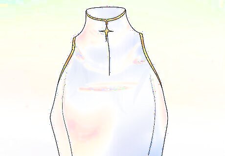 Attach black, criss-crossing straps to the jacket. Cut two strips of black elastic and attach the ends to the insides of the jacket, so one end of each strap is connected to the left side of the coat and the other end is connected to the right. Criss-cross the elastic so it forms an “X” shape once attached. You can use fabric glue to attach the elastic, or sew the pieces in place. Cut the strips of elastic long enough that the jacket will still fit your torso when you put it on (and you can put the jacket on comfortably). Rumi’s jacket also has a small golden star-shaped brooch attached to the very center of the straps, where they cross.