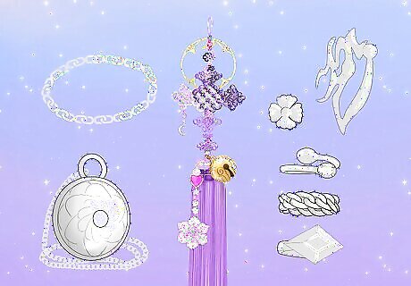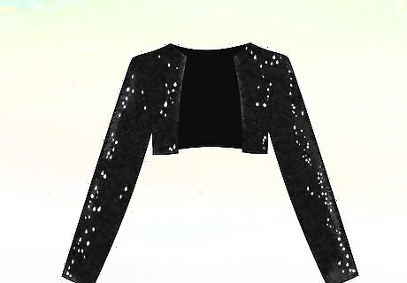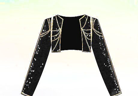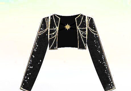 Start with a black cropped jacket. You can add this flashy jacket to the above white suit costume to achieve Rumi’s complete “Golden” outfit! If you can find a black sequin jacket like this one, that’s ideal. If not, it’s okay to just shop for a black cropped jacket instead—either online or, if you prefer, in person at retailers and thrift stores. If you’d rather buy the jacket pre-made and skip the assemblage parts, you can get a “Golden” Rumi costume online from retailers like Light in the Box, Cossky, and Amazon. You can also find Rumi cosplay costumes for sale on Etsy, like this one or this costume set.