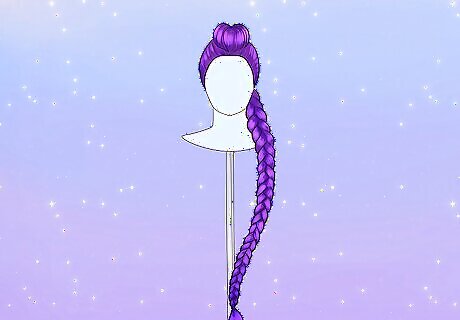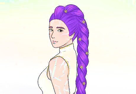 Add golden trim to the jacket. Rumi’s jacket is decked out with gold accents, which you can recreate! The easiest way to apply trim is by using gold bias tape; it’ll stick right to the fabric without any ironing or sewing. You could also get some gold fabric trim and sew it to the jacket yourself, but we wouldn’t recommend that unless you’re comfortable with a sewing machine. Add trim to the following areas: Apply golden trim to the edges of the jacket and two stripes vertically down the sleeves (from shoulder to cuff). Then, add 5 strips of golden trim to the front of the jacket on either side. Fan them out so the top one is going up toward the neck, the bottom is going down, and the middle 3 are draped diagonally toward the shoulder. Create a circle around each shoulder with two strips of golden trim, so they’re surrounding the Finally, add two thicker strips of golden trim around the jacket’s arm-holes, as though you’re outlining where a backpack’s straps might be.