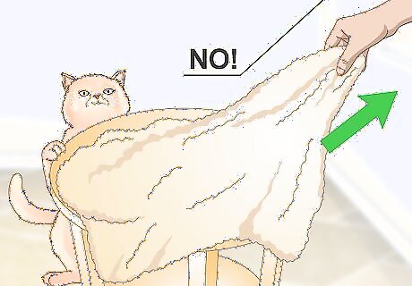 Say "no" and be consistent. If your cat finds wool or another unapproved item to suck on, remove the item, firmly say "no", and tap your cat on the nose. Do this each time you see your cat sucking on something it shouldn't. Your cat will soon learn that this is undesirable behavior. If your cat sucks on your clothing, try blowing in her face while saying, "No." Never yell or get angry at your cat. Keep in mind that your cat is probably sucking because it's trying to relieve anxiety.