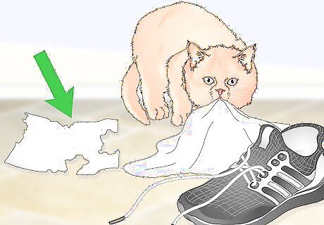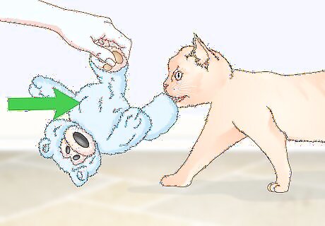 Give your cat a soft comforting toy. You might find your cat sucking on any type of cloth even though you've removed all of the wool. Redirect your cat's behavior to a safe, comforting soft toy. Give your cat a stuffed animal or soft cat toy and put it where your cat usually sucks wool. Your cat may eventually cuddle or suck on the stuffed animal or soft toy when it's feeling overwhelmed or needs the stimulation.