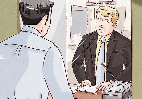 Attend an interview at the US Embassy in London. Bring your passport, 2 passport-sized photos, the confirmation page you printed, your birth certificate, and the letter you were sent about the interview. The interview will take around 2 hours and the consular officer conducting it may ask you questions about why you plan on moving to the United States. Once the interview is over, they’ll tell you if you’re approved or denied for your visa. If you’re approved the Embassy will retain your passport and send it back with your visa and immigration packet in about 2 weeks. It may take several months to reschedule your interview appointment if you aren’t able to attend. If you have not already paid visa fees for your application, you can pay with cash or check when you visit the US Embassy.