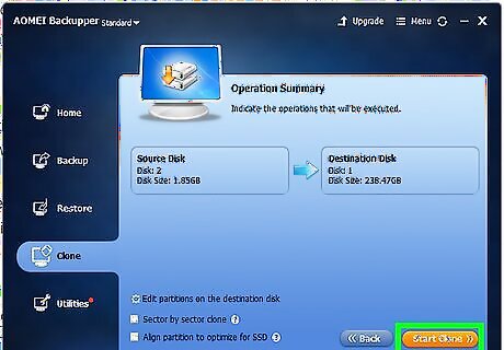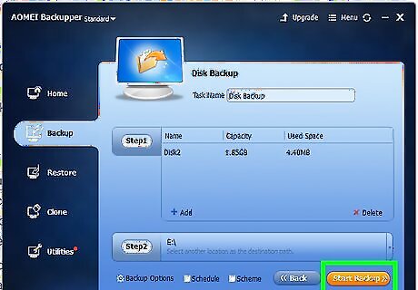 Click Start Backup. Once you have selected a disk to backup and a destination for the image file, click the orange button that says "Start Backup" in the lower-right corner of the AOMEI Backupper window. If something goes wrong during the cloning process, you can restore your system from this system image. Read Create and Use A System Image on PC to learn more about how to recover your disk using a system image.