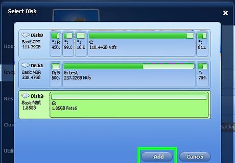 Click the disk you want to backup and click Add. Click the disk(s) you want to backup. The selected disks will be highlighted in green. Click "Add" at the bottom of the app window.