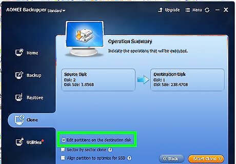 Select "Edit partitions on the destination disk". This will give you a few options for partitioning the new drive. It is recommended that you choose "Fit partition to entire disk". If you are transferring to a new SSD, you should check "Align partition to optimize for SSD". This will improve the performance of your SSD.