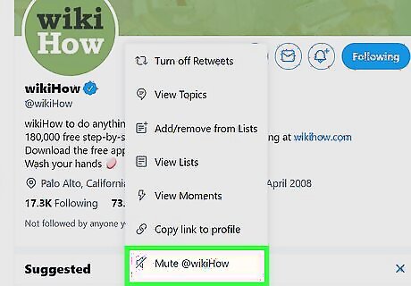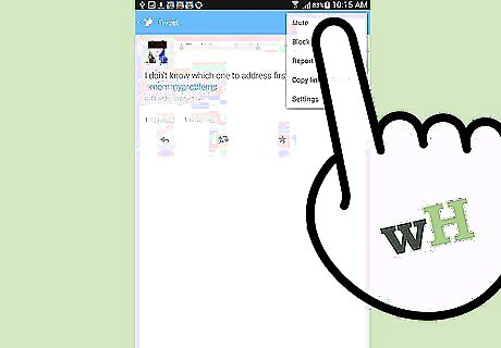 Mute that person. Click on the 3 horizontal dots on the top-right side of the screen. This will cause a drop-down menu to appear. From the options in the drop-down menu, select “Mute @[X handle of the person].” You will get one final pop-up window asking if you are sure you want to mute this person. Tap “Yes” to totally mute that particular tweeter.
