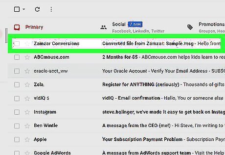 Open your converted MSG file's page. Once the file has been converted, Zamzar will send a confirmation email to you. This is where you'll find your MSG file's download page link: Open your email inbox. Open the "Converted file from Zamzar" email from Zamzar. Be sure to check your Spam folder (and Updates folder, if applicable) if you don't see the email within 5 minutes. Click the long link near the bottom of the email.