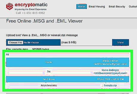 Know when to use Encryptomatic. If you just want to view an email without downloading it, Encryptomatic allows you to do so with emails up to 8 megabytes in size (including attachments). If the email in question has any attachments, you can download them from the viewer page as well. The main downside to Encryptomatic is its size limit. If you need to download several attachments from your MSG file, you might be better off using Zamzar.