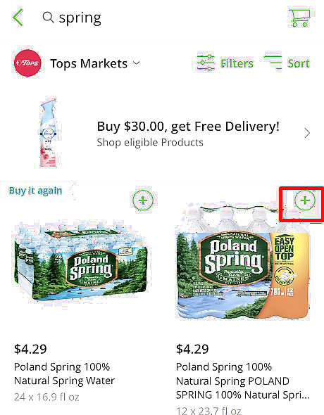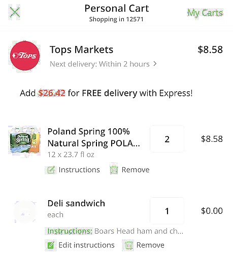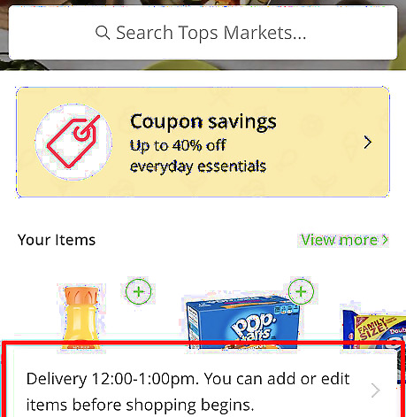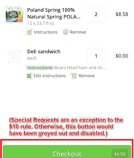 Add your item. Tap the + sign from the top right corner of the product's picture to add one of each item to your Instacart shopping cart. Successive taps without letting the dialog box timeout will result in adding additional quantities of the item. Don't worry too much about the product's picture - but watch for its name and size. As you add items to the cart, you'll see a small banner display "Added to cart" at the bottom of the screen, and you'll see a tiny balloon with the number of items in the cart icon at the top of the screen. If you see a "Save (price)" button below the item, these are Instacart coupons which will allow you to save money. Tap them before adding your quantity to the cart. If there is a Buy 1 item-Get 1 Free offer, make sure that you have at least a quantity of two in the cart, and on final totaling, your total will change to reflect the price difference for the adjusted "Get 1 Free" portion. During a shopping session on the Instacart website, once you add an item to your cart, your cart list will fly out from the right side of the page to show all the items. If you'd rather review the items via the item's page itself (not in the search page), you can tap the units switch in the bottom left corner, then tap "Add to Cart". Fruits and produce sold in bunches (such as bananas) should be placed in an approximate multi quantity. A quantity of 1 for bananas will get you just that - 1 banana (not one bunch of bananas). You can chat with your Shopper explaining your decision towards the beginning of your order and they will try to comply with your decision, but keep this in mind when ordering these types of items from Instacart. Meats and some produce generally sold by the pound will be sold starting at 1 lb. These items are sold at .25 lb intervals beginning as low as .25 lbs. Instacart prefills the starting weight at 1 lb, but you can tweak this using the + and - signs to adjust the weight. (The minus sign will be available if you tap the item first. If you tap the item from the search page, you will have to tap the + sign before seeing the - and tweak from there. You can quickly add the product to your shopping list right from the search page by pressing the + sign. However, if you decide to tap the item to open the product's page, you'll find the two quantity and ""Add to Cart" buttons at the bottom of the screen for additional details. In item view, at the bottom of the screen, you'll have a +/- switch with an Add to Cart button to find the units. If you need to change its quantity to a lower number, press the - button then tap "Change qty". If you need to remove the item entirely, tap the - until 0 displays then tap "Remove". Add items until you reach at least the minimum order threshold of (generally $10, not counting the delivery charge), but there are some exceptions to this rule.