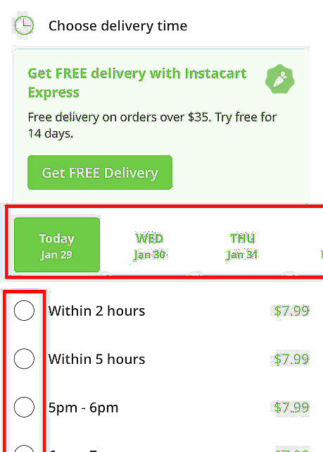 Tell Instacart when you'd like to receive your goods. Instacart generally asks when you'd like to receive your goods. Although most responses include "Within 2 hours" and "Within 5 hours", there are hour-long blocks below these choices, but you'll need to trust your shopper to be On-Time or a minute or so late when chosen in these hour block choices. Tap the radio checkbox to the left of the delivery time. After selecting your choice, you may receive a dialog box asking you if you'd like to start Instacart Express for a year and save on the delivery costs for this order. To move through, just tap the X button in the top right corner of this dialog box.