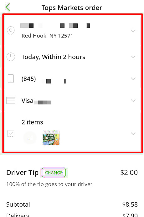 Look over your order's delivery details and payment methods. Make sure that the delivery address is right, and that there's a phone number on file- there's a current credit/debit card on file and that a tip is set (if you'd like to digitally tip them- much preferred). Sometimes Instacart offers tip choices as a scale of percentages, but sometimes the tip choices are given in even dollar amounts. If something is off, you can tap the line on the screen and this will "drop down" to fix the problem or chose another method. There is a Change button to change the tip.