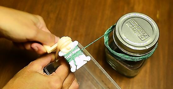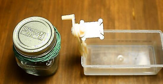 Place the thread around a wide jar and push the bobbin into the winder. Although you can keep the skein of thread loose as you wind it, it may tangle so put it around a sturdy jar or container to keep the threads in place. Take a bobbin and insert it into the bobbin winder. Since the bobbin is secure, there's no need to hold it in place while you're winding.