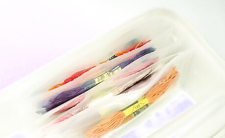 Place thread into bags before putting them in totes for a quick storage solution. If you're short on time and just want a fast way to keep your thread separate, get out a box of sealable bags. Place as many skeins or bobbins of thread as you like into each bag and label the outside of the with the thread's color number. Then, put the bags into plastic totes or shoe boxes. Organize the bags of thread by color, project, or thread number. Keep in mind that if you're placing more than 1 skein of thread into a bag, the thread is more likely to tangle.