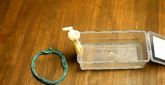 Snap the winder onto a bobbin box and unwrap a skein of thread. Get out a plastic bobbin box that has individual compartments and snap the base of the bobbin winder onto the side of the open compartment. Then, peel the paper label off of the first skein of thread that you want to wind. You can write the color number directly on the tip of the bobbin or trim the paper label and tape it to the back of the bobbin.