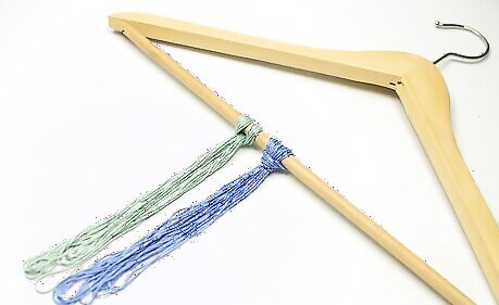 Tie skeins of thread from the bottom bar of a hanger to store thread in a closet. Untwist a skein to make a giant loop of thread and find the knot on the loop. Cut through all the threads so you have a long strand and it in half. Place the bottom bar of a hanger over the folded end of the thread. Then, gather the other end of the thread and bring it up through the folded to form a clove hitch knot. You can use a plastic, wooden, or metal hanger to store your thread. Hang 10 to 12 skeins of thread depending on the size of the hanger.