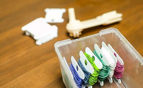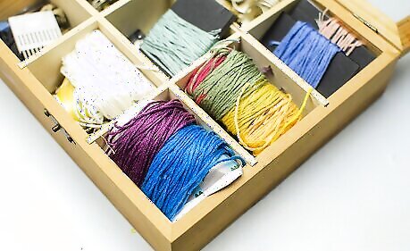 Place thread into a flat storage container with dividers for easy traveling. If you need a portable storage solution for just 1 project, buy a clear container that's divided into small compartments. These are usually sold to store beads, but you can place 1 or 2 skeins or bobbins of thread into each compartment. The divided compartments prevent the thread from sliding around and getting tangled.