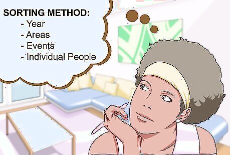 Pick a sorting method. There are many different ways that you can successfully sort. If you aren’t sure which to try, think about your end goal. Are you putting photos together to celebrate someone’s birthday? Then sort by person. Are you organizing a family yearbook? Then sort by date or event. Typically, the most popular ways to sort are by: Years or eras Events, such as weddings Individual people