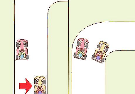 Break later to beat another kart as you take the corner. If you break later than the kart that’s next to you as you take a corner, you’ll be faster than them and can squeeze on the inside of the track. Make sure to practice taking corners and breaking before trying this, as it could cause a collision if you take the corner too wide.