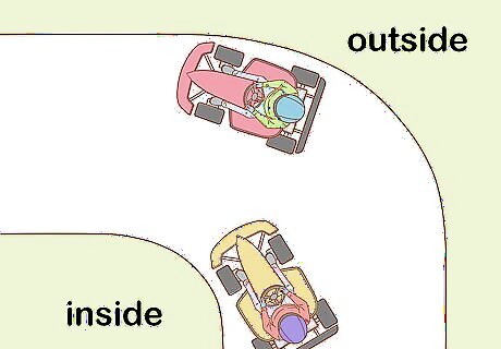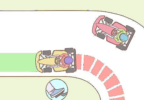 Break in advance of a corner to avoid overshooting it. Make sure to slow down when you’re taking corners or overtaking soon enough so that you don’t overshoot the corner. If you’re new to karting, go at a slower speed when taking corners so that you can get used to driving your kart. Since you’ll be trying to pass someone on the inside track, overshooting the corner could cause a collision.