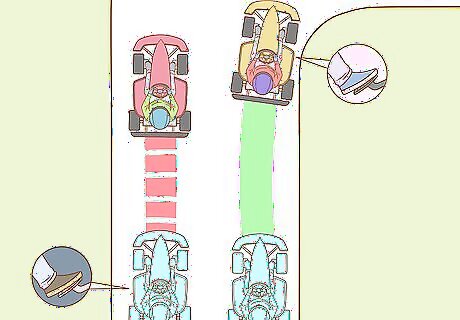 Drive up close behind the other driver to reduce wind resistance. Accelerate during a long straightaway and get as close as you can behind the kart that you want to overtake. Driving directly behind another kart will reduce wind resistance and drag which will cause you to go faster. You should be about 1–2 metres (3.3–6.6 ft) behind the kart you want to overtake. The area behind the other kart that has reduced wind resistance is known as the slipstream.