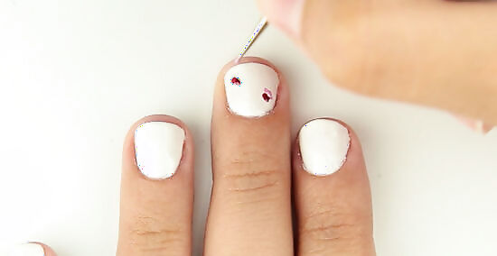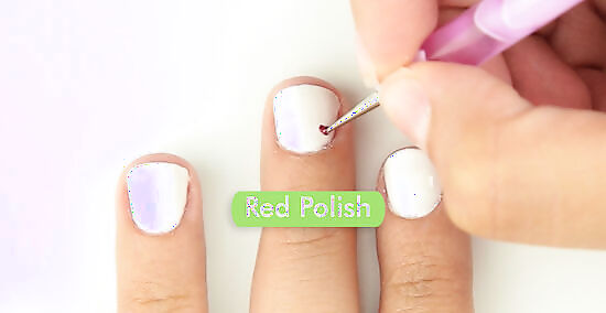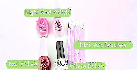 Gather your supplies. You can get most of the supplies at a beauty store or craft store. If you can't find anything, you can also order supplies online. You will need the following: Four nail art brushes A light shade of nail polish for your base, like a white or pastel color Red and light red nail polish Green and light green nail polish