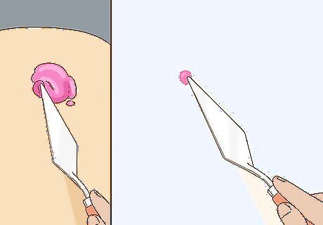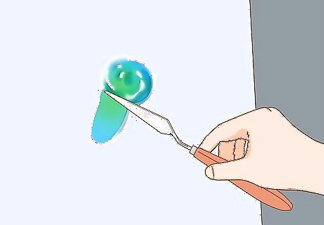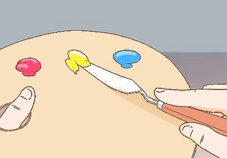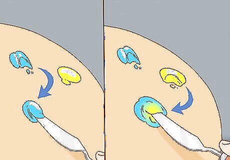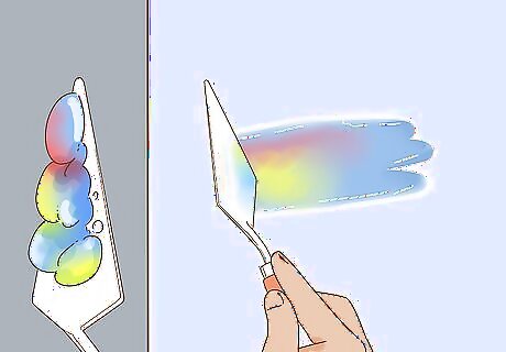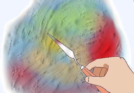 Blend paint colors together on the palette using the knife. Load up the knife with a single color and place it onto a clean spot near the center of the palette. Wipe off the knife with a paper towel or rag and then pick up another color. Add the new color to the same spot. Use the bottom or top of the blade to manipulate and combine the paints. Work in circular or seesaw motions to mix the colors, continuously applying downward pressure. Knead the colors together until you reach the right shade. Feel free to blend the colors completely or keep them partially separate. For an interesting effect, one color can be placed on the knife on top of another. This will allow the two colors to blend in a unique way as you place the stroke on the surface.