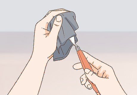 Clean paint off of the knife with a cloth or paper towel before changing colors. Use a dry or slightly damp cloth or a paper towel to wipe the wet paint off of the knife. You can pinch the base of the knife between the cloth and drag the cloth outwards to pull off the paint. Or try wiping each side of the knife with the cloth. Clean off the thin edges as well as the “neck” of the blade which may have collected some paint. Keep the knife clean to avoid accidentally transferring colors or unintentionally mixing a murky shade.