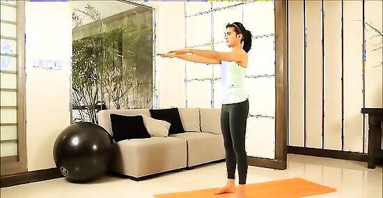 Reach forward and focus your eyes straight ahead while breathing through your nose. Hold this posture for about twenty seconds, and then slowly go back to a standing position without altering the position of your arms. Once you are at the starting position you can relax your arms.