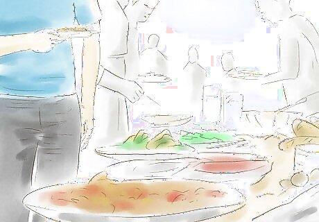 Coordinate with your potluck volunteers so they arrive about an hour before mealtime and you can begin setting up prior to the designated mealtime. Wipe off any tables that will be used for serving food. Set the plates, cutlery and napkins at the beginning of the food line, place the meats next followed by the side dishes. Place drinks and desserts and the end of the table or set up another table for those items. If the dish isn't obvious, the dish bringer should label the dish with the name of the food and note if there are nuts, or meats in it. Just "Veggie casserole - has nuts" or "pasta salad - has bacon" will do. The mention of nuts is especially important if someone in your office has a nut allergy. The mention of meat is nice for vegetarians, especially when a meat or broth may be mixed in and not obvious at first glance. Label the dish or tape the note to it. Taping the note to the table may not work since dishes may get moved around as people are serving themselves.
