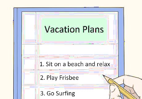 List what you want to do on your vacation. Sometimes identifying the things that you would most like to do on your vacation is a good way to start planning it and reduce the stress of making the trip at the same time. There are some special destinations that you need to go to experience certain things, but you may be able to engage in other activities anywhere you go. For example, if you want to sit on a beach and relax, then you will need to find a beach location. However, if you want to get a massage during your vacation, then you can go just about anywhere. Or, if it has always been your dream to be a yogi, then taking a vacation at a resort that offers lots of different yoga classes may be helpful. If you have always wanted to be a chef, then taking a cooking class during your vacation might be a good option.