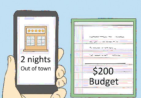 Look at your budget for the vacation. Some vacations can be quite cost effective, while others can be incredibly expensive. Much of this depends on where you want to go and how long you want to spend there. Before you start planning your mental health vacation, identify how much money you have available for the trip. For example, if you have $2,000 available for a vacation, then you can probably afford to take an international trip as long as you get a good deal on airfare and lodging and watch your spending. However, if you only have $200 to spend, then one or two nights out of town at a budget hotel is a more realistic vacation plan.
