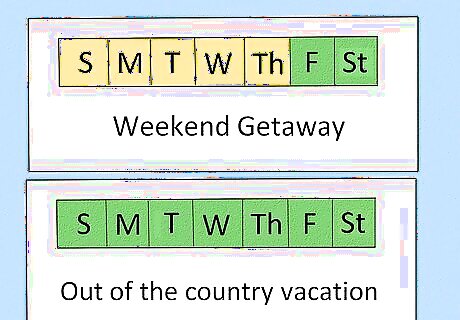 Identify what you want to take a break from. Vacations can provide many different benefits, from reducing work stress to offering a chance to connect with loved ones. You probably have some specific things that you would like a vacation from, such as work, household chores, or even certain people. Think about the things you would like to have a break from and try to identify what type of vacation would give you the best break from these stressors. For example, you might decide that you need to take a full week off of work to get a break from your professional obligations. Or, you might decide that a weekend getaway will be enough to refresh you from housework burnout. Or, perhaps you would benefit from a solo day trip to reconnect with yourself and get away from your personal obligations.