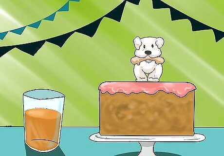 Make sure the party has food and drink that everyone will enjoy. No dog party would be complete without pet-friendly and human food inspired by man’s best friend. Consider pet-safe food if dogs are in attendance. Even though the dogs may be getting special dog treats, be sure to eliminate any food from your menu that could pose a toxic hazard to dogs such as chocolate, grapes or onions. Find dog treats from a local pet food store instead and keep all human food safely away from the dogs. Have plenty of bowls of water around for the dogs to drink from. Create a dog or bone shaped food to accentuate your theme. Whether it’s a birthday cake or a congratulatory dessert, ask your baker (or do it yourself) to create a doggie inspired centerpiece dessert. Cookies made into the shape of bones can be a lot of fun too, although make it clear which are for the dogs and which are suitable for human consumption!