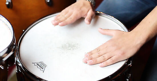 Start learning to drum with your hands. You don't have to have a monstrous kit with a gong like Neil Peart from Rush to get started drumming. You don't even have to have a kit at all. To get started on the basics, use your hands and tops of your thighs in a seated position to learn basic drum-kit rhythms. Listen to music with obvious rhythms and try to mock the rhythm with your hands. Many beginners can get frustrated upon plopping down behind a kit and not being able to play a simple rhythm yet. It's a good idea to start getting some sense of rhythm before dropping the cash on a big drum kit to practice on, or before giving yourself an opportunity to get frustrated.