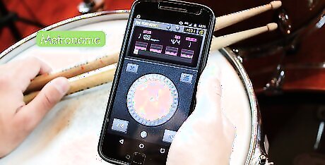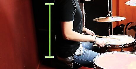 Learn to sit at the kit with the proper posture. Good posture will make you more comfortable during practice and help you reach the drums more easily. You'll sound better and enjoy playing more by improving your posture. Sit up straight and keep your elbows in. Stay in tight to the kit, keeping the floor pedals at a comfortable distance from you. EXPERT TIP Bart Robley Bart Robley Drummer, Drum Teacher, and Author Bart Robley is a Drummer, Drum Teacher, and Author based in Ontario, California. Bart has been sharing his expertise in drumming knowledge through teaching for over 30 years. He makes his teachings globally accessible by offering lessons in an online format. Bart has authored three instructional books and created three instructional DVDs. He received a Bronze Telly Award in 2009 for his DVD "School Of Hard Rocks. Additionally, Bart has been the drummer for the Sam Morrison Band for over 25 years. Bart Robley Bart Robley Drummer, Drum Teacher, and Author Mirrors identify technique flaws. Practicing in front of a mirror is super helpful. You can instantly see things you'd normally miss, like if your posture is wonky or your hands are in a weird position. The mirror doesn't lie — it shows you exactly what needs work.