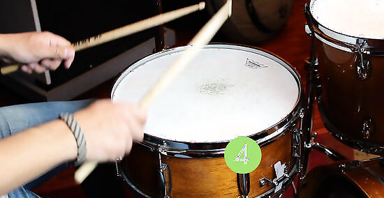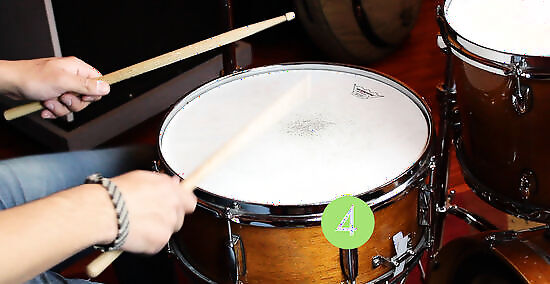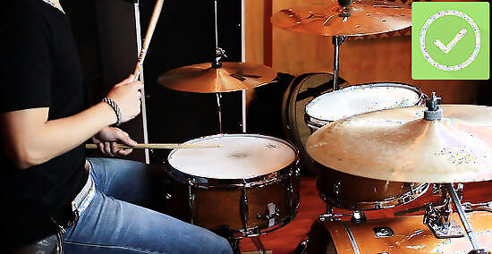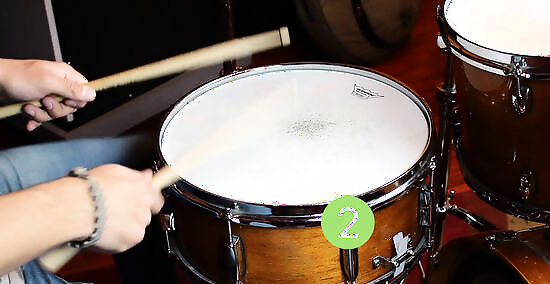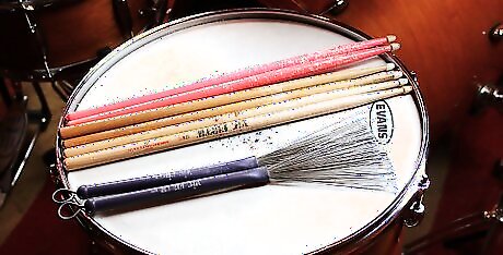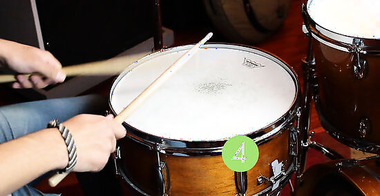 Get comfortable holding the drum sticks. There are two main ways to hold drum sticks, called the matched grip and the traditional grip. In the matched grip, you hold the sticks between your thumb and index finger a few inches from the bottom of the sticks. Wrap your remaining fingers around the sticks. Be sure the back side of your hands are facing up rather than facing to the side. This method is the most common way of holding sticks, allowing you plenty of wrist control and comfort. In the traditional grip, you'll hold the stick in your non-dominant hand by resting the stick in the cradle between your thumb and index finger and on top of your ring finger. Wrap your thumb, index and middle fingers around the stick. Hold the other stick using a matched grip. Some jazz drummers use a traditional grip to offer a different kind of control on the snare drum, playing intricate rhythms on it as part of fills.