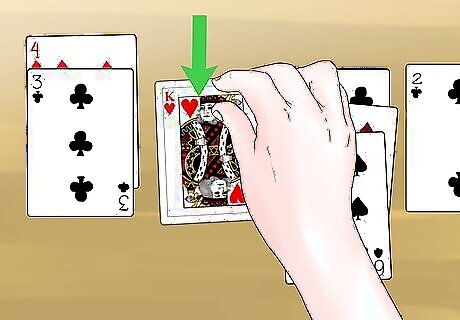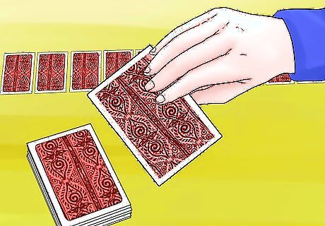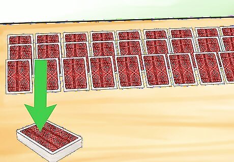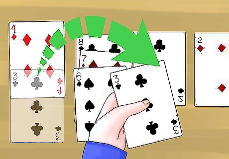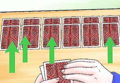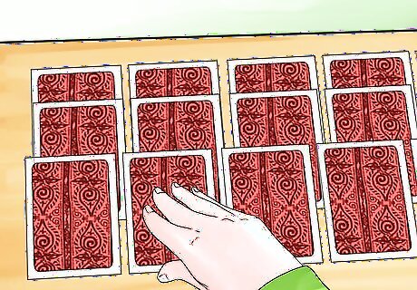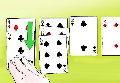 Deal 3 more cards face down on each pile. Lay each card so it exposes a little bit of the card underneath it. This way, you can easily see how many cards are left in a pile. Each pile should now have 4 cards in it. Again, avoid peeking at these cards.