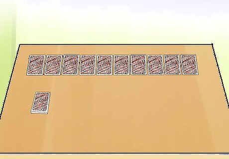 Deal a line of 10 face down cards. Keep the cards separated for now. The 10 cards form the tableau piles where most of the game is played. You don’t get to look at these cards yet.