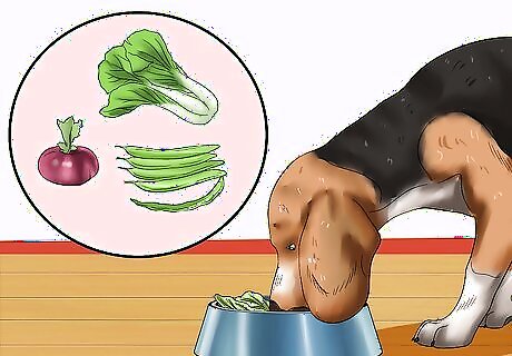 Include a mix of carbohydrates and vegetables. Since half of your dog's meal will come from meat, the other half should be made up of equal parts carbohydrates and vegetables. Carbohydrates can come from cooked rice, pasta, or boiled potato. Good vegetables include cooked: Green leafy vegetables (such as spinach, kale, spring greens, brussel sprouts, Bok choy, and chard) Butternut squash Turnip Parsnip French beans Okra
