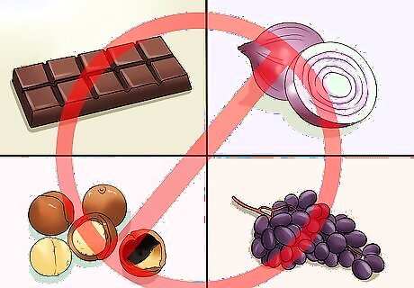 Know what foods to avoid feeding your dog. Some foods we humans safely eat are actually toxic to dogs. In many cases, your dog would need to eat a large quantity or small amounts regularly before developing health problems, but it's not worth the risk. Monitor your dog for several weeks if you fear he's eaten something he shouldn't. If you are not sure if a food is safe, speak to your veterinarian. You should avoid feeding your dog: Garlic: The more concentrated the garlic is, the more dangerous it is to your dog. Make sure any chicken or vegetable broths you cook with don't contain dried garlic. Onions in any form (fried, baked, raw, or dried) Grapes, raisins or sultanas: These cause kidney failure. Avocado: This has contains persin which dogs can't tolerate. Persin toxicity causes a range of problems, from mild stomach upset to fluid in the chest and breathing difficulties. Chocolate Bread dough Xylitol (artificial sweetener found in low sugar cookies, cakes, and sweets) Alcohol Macadamia nuts