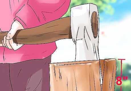 Split the section, if needed. If the log you cut down is fairly small (less than 5"), it is not necessary to split it into staves at this point. If it is 6" to 8", split it down the middle into two symmetrical halves. If larger that 8", quarter it. This is accomplished by embedding a hatchet in the middle of one end of the log. From there, use wedges, splitting mauls, or whatever else is available to carefully split the log the rest of its length.